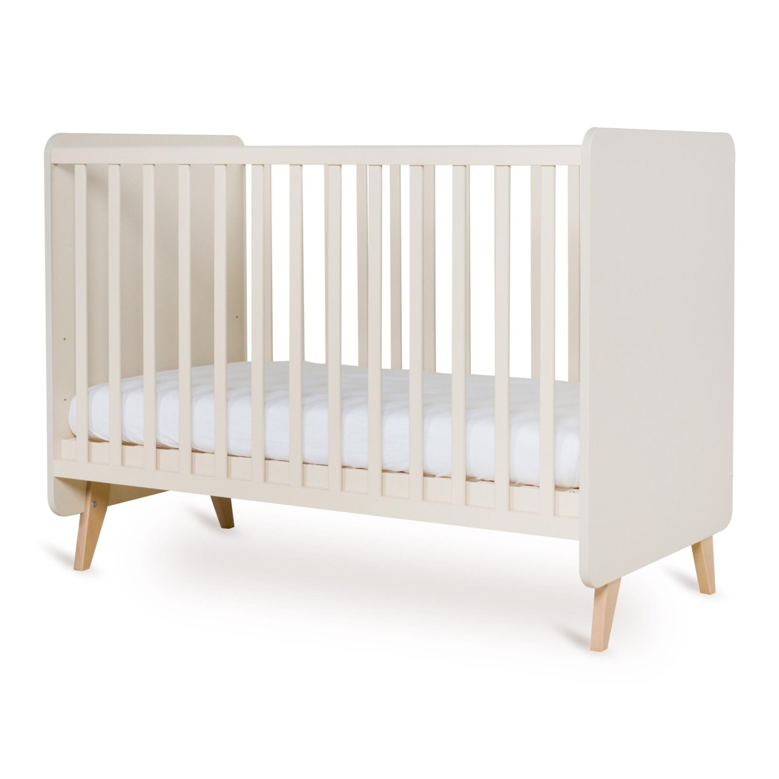Esta cuna incorpora una base de colchón ajustable en tres alturas (29 cm, 44 cm y 59 cm), permitiendo adaptar el descanso a cada etapa del desarrollo del bebé. Este sistema facilita el acceso y el cuidado diario, aportando ergonomía y seguridad tanto para el niño como para los padres.