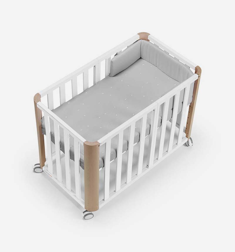 Incluye todo lo necesario desde el primer día: kit de colecho, barrera Montessori, colchón Air Foam de 90×48 cm, nórdico con protector, bajera Tencel y puente para el colecho. También dispone de somier extensible con 6 posiciones de altura, un lateral extraíble en ambas configuraciones y 4 ruedas con freno para facilitar su movilidad.